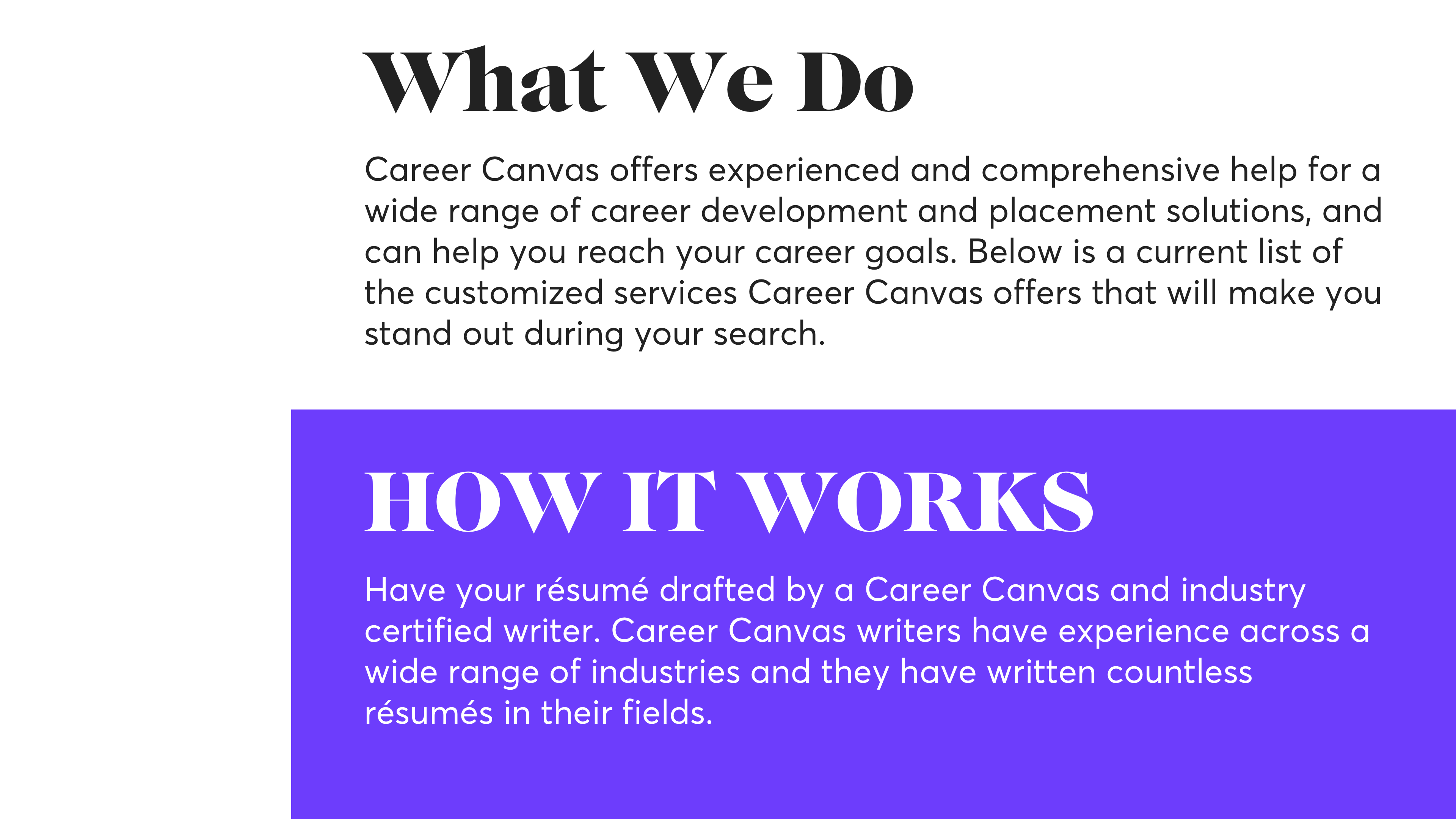 Career Canvas is a startup looking to help aspiring and experienced people reach their job goals by providing professional writing and career coaching services. At an early stage, I was asked to come on board and design a complete brand identity and style guide for the company in addition to web design and front-end development. Each stage of the design process brought unique challenges and helped me grow as a designer and a learner.