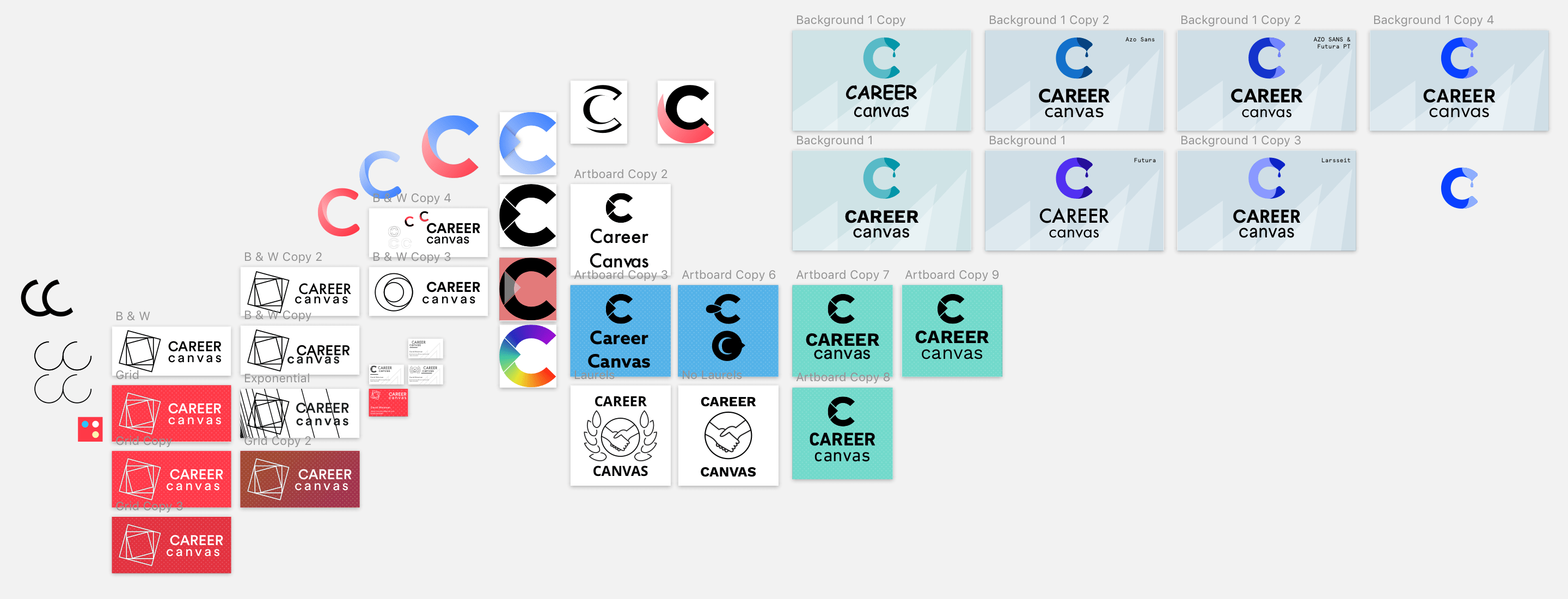 In the early parts of this process, I sketched a series of different concepts for the brand's mark or icon and iterated on the most promising ones. I had to stay away from marks that only relied on Career Canvas's initials because of the many prominent brands that already take that form (e.g. Chanel). Instead, I started with some very abstract marks but found those did not achieve the goal of communicating with people who were unfamiliar with the company.